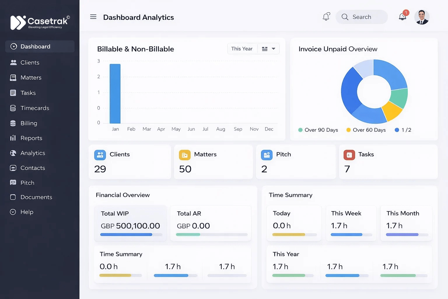 Monitor case progress, team productivity, and financial performance — all from a single, central dashboard.