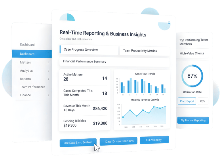 Gain real-time insights into case progress, team efficiency, and firm performance to make smarter decisions and drive better outcomes.